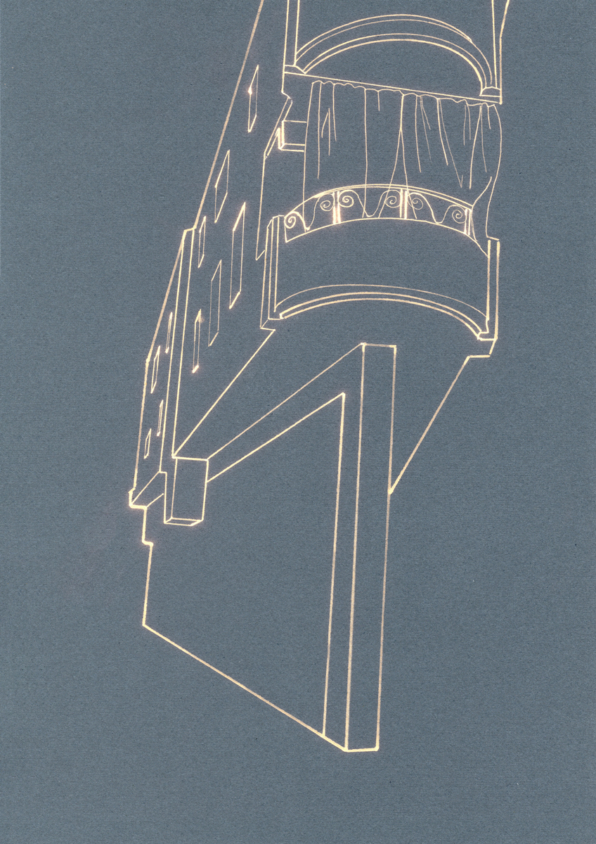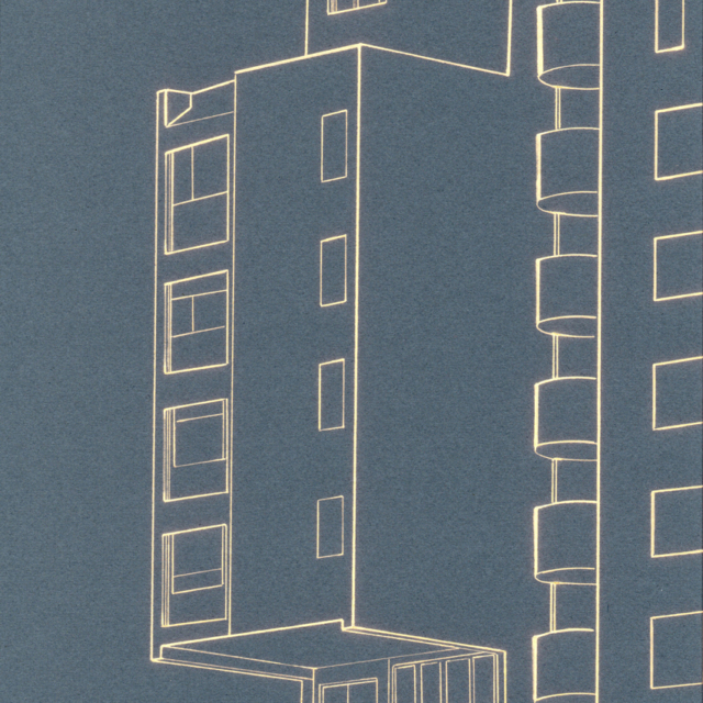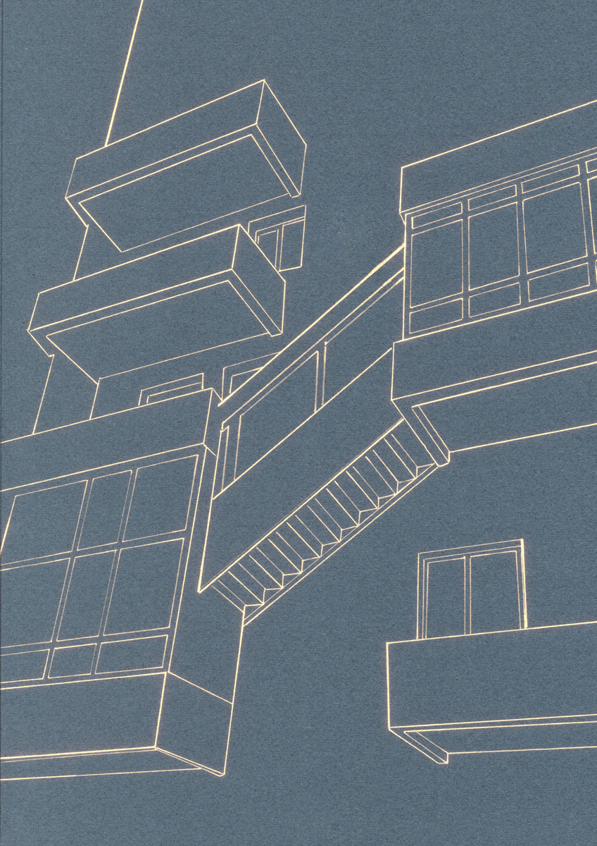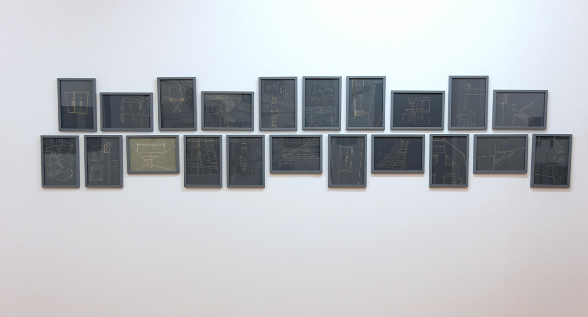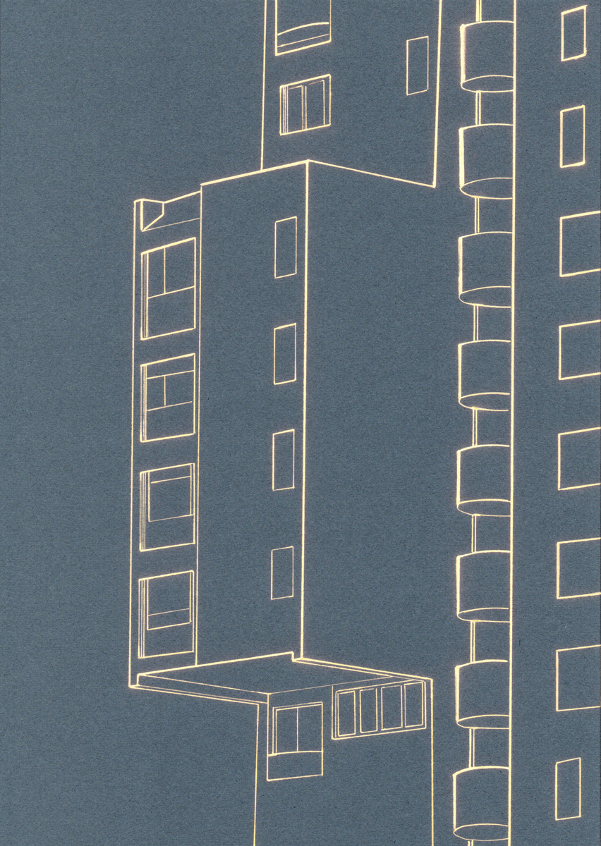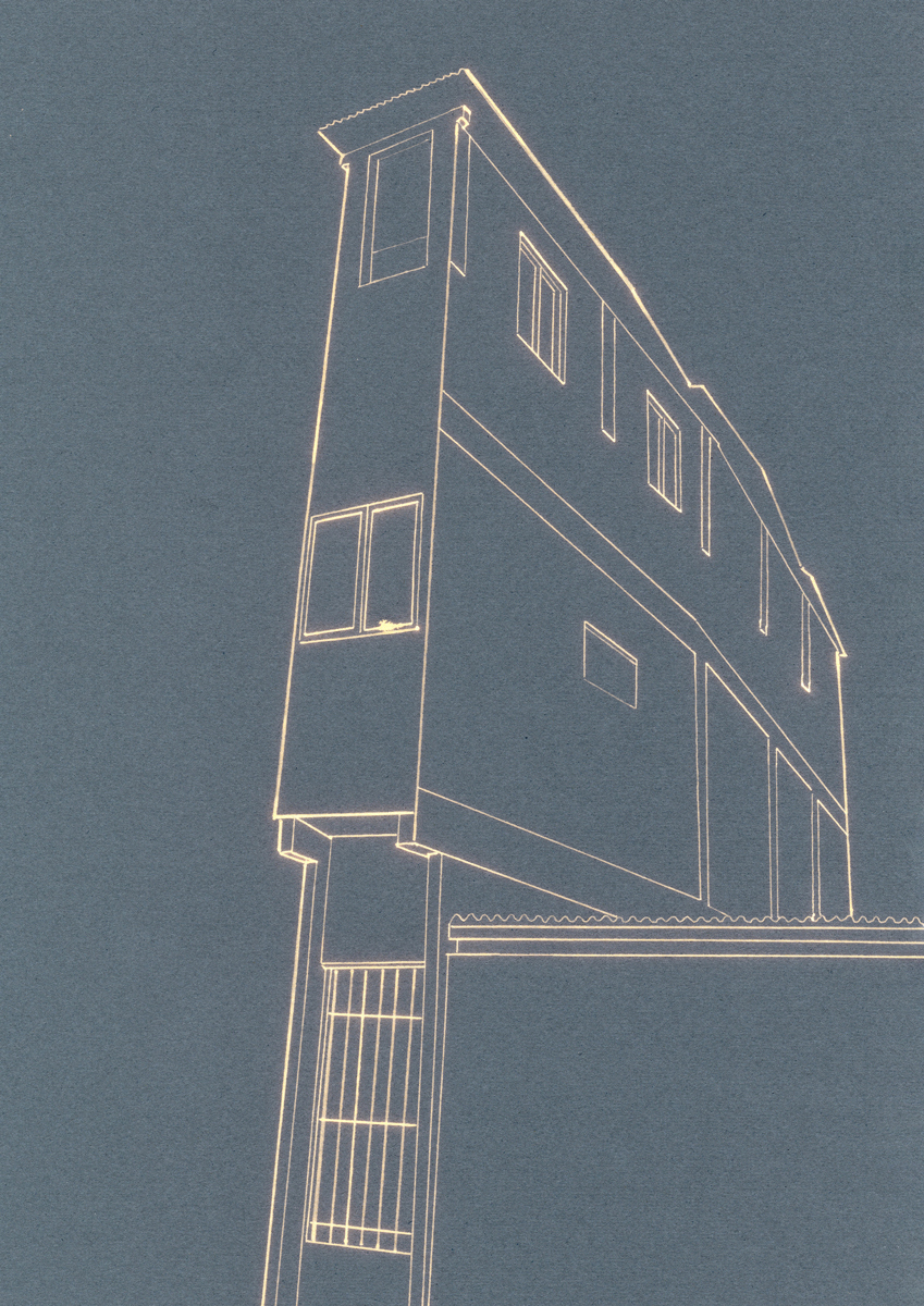 In an expansive series of architectural drawings, Badry continues his speculation on non-functional objects, through depictions of seemingly impossible, but actually existent homes. Applying acid bleach to coloured paper, Badry uses this common household cleaning material to render his drawings. Buildings perch precariously on narrow bases, houses crowd one another like shoppers in a queue, and aspirational towers teeter tentatively over absent cityscapes. Borrowing the blueprint-like aesthetics of lighter lines on a dark background, these drawings, ironically, propose plans for an inherently unplanned phenomenon, referencing the politics of informal housing.