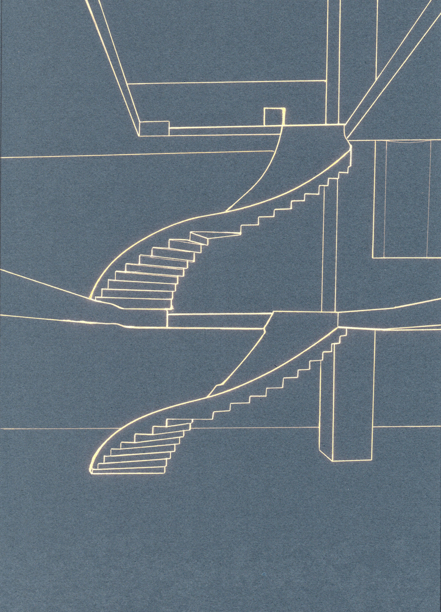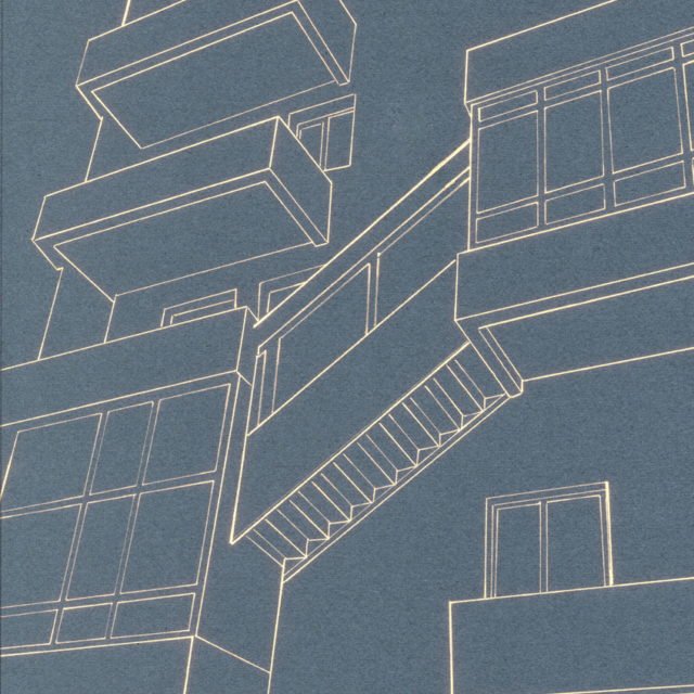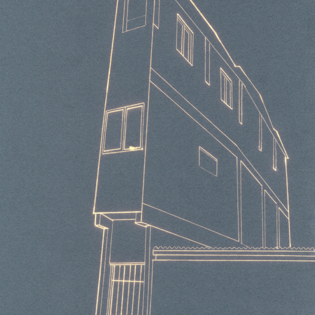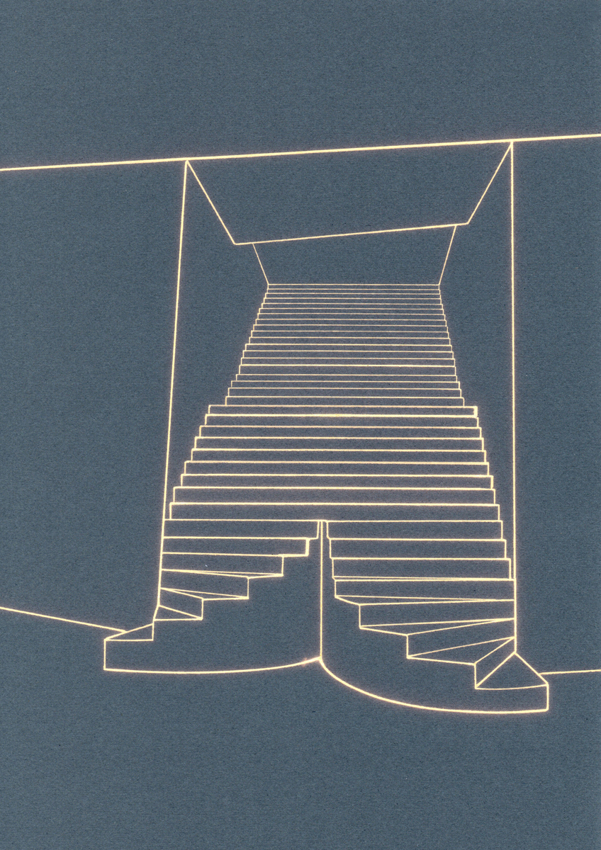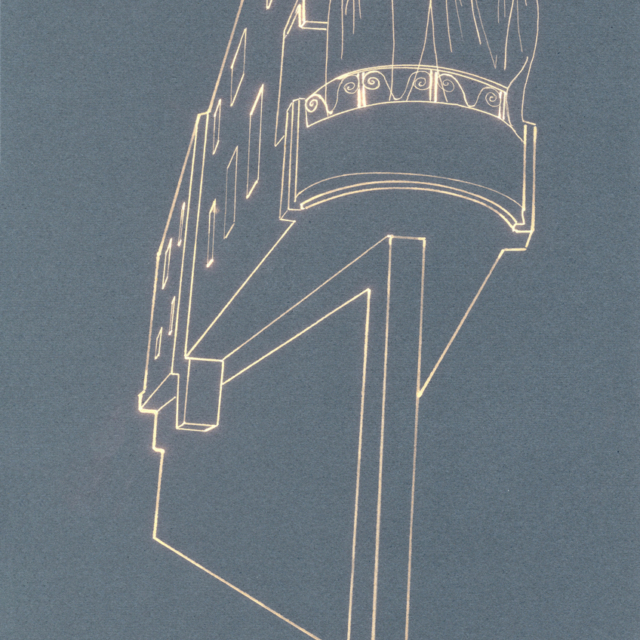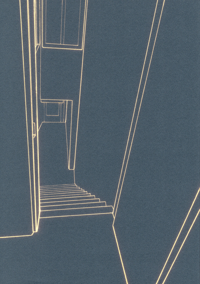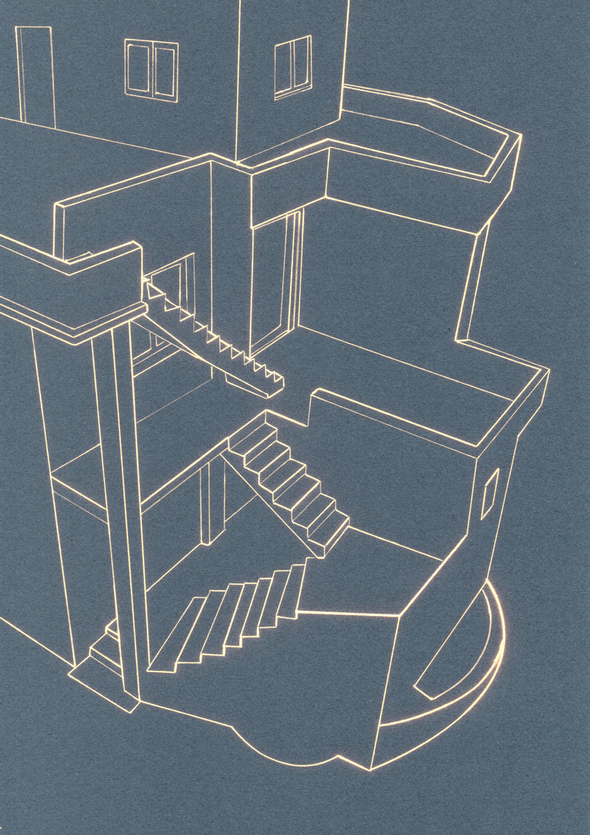 In an expansive series of architectural drawings, Badry continues his speculation on non-functional objects, through depictions of seemingly impossible, but actually existent homes. Applying acid bleach to coloured paper, Badry uses this common household cleaning material to render his drawings. Buildings perch precariously on narrow bases, houses crowd one another like shoppers in a queue, and aspirational towers teeter tentatively over absent cityscapes. Borrowing the blueprint-like aesthetics of lighter lines on a dark background, these drawings, ironically, propose plans for an inherently unplanned phenomenon, referencing the politics of informal housing.