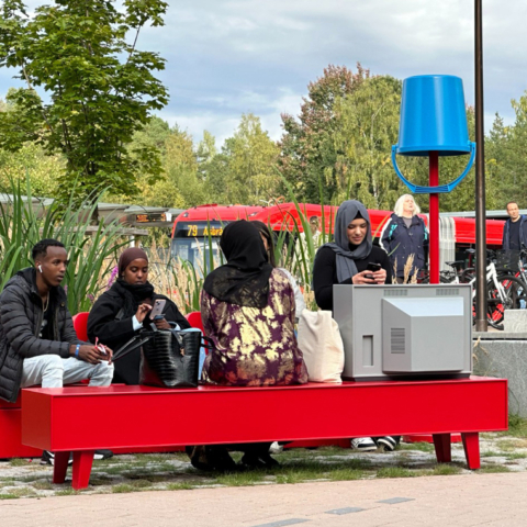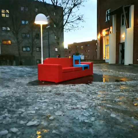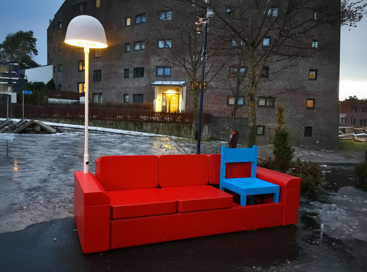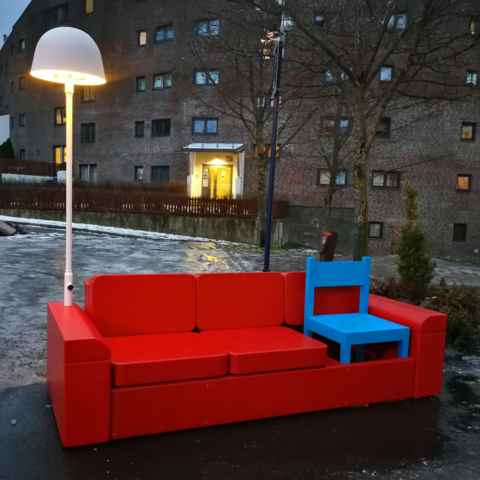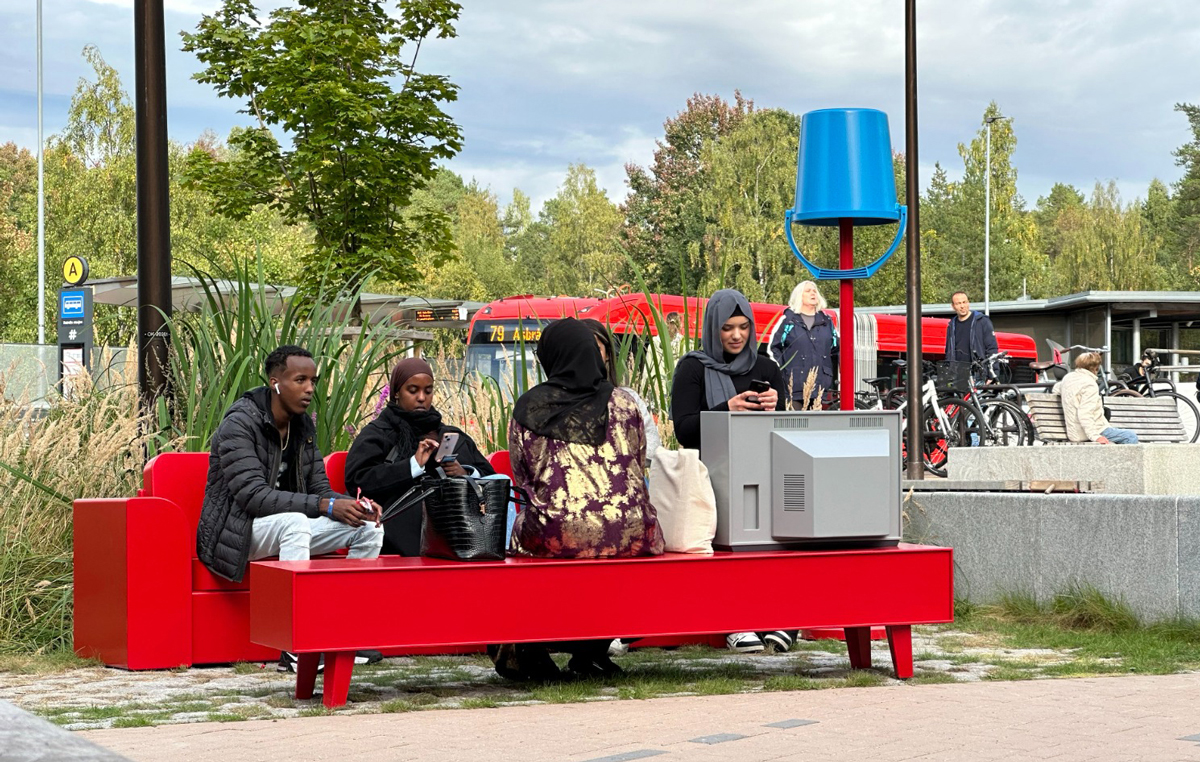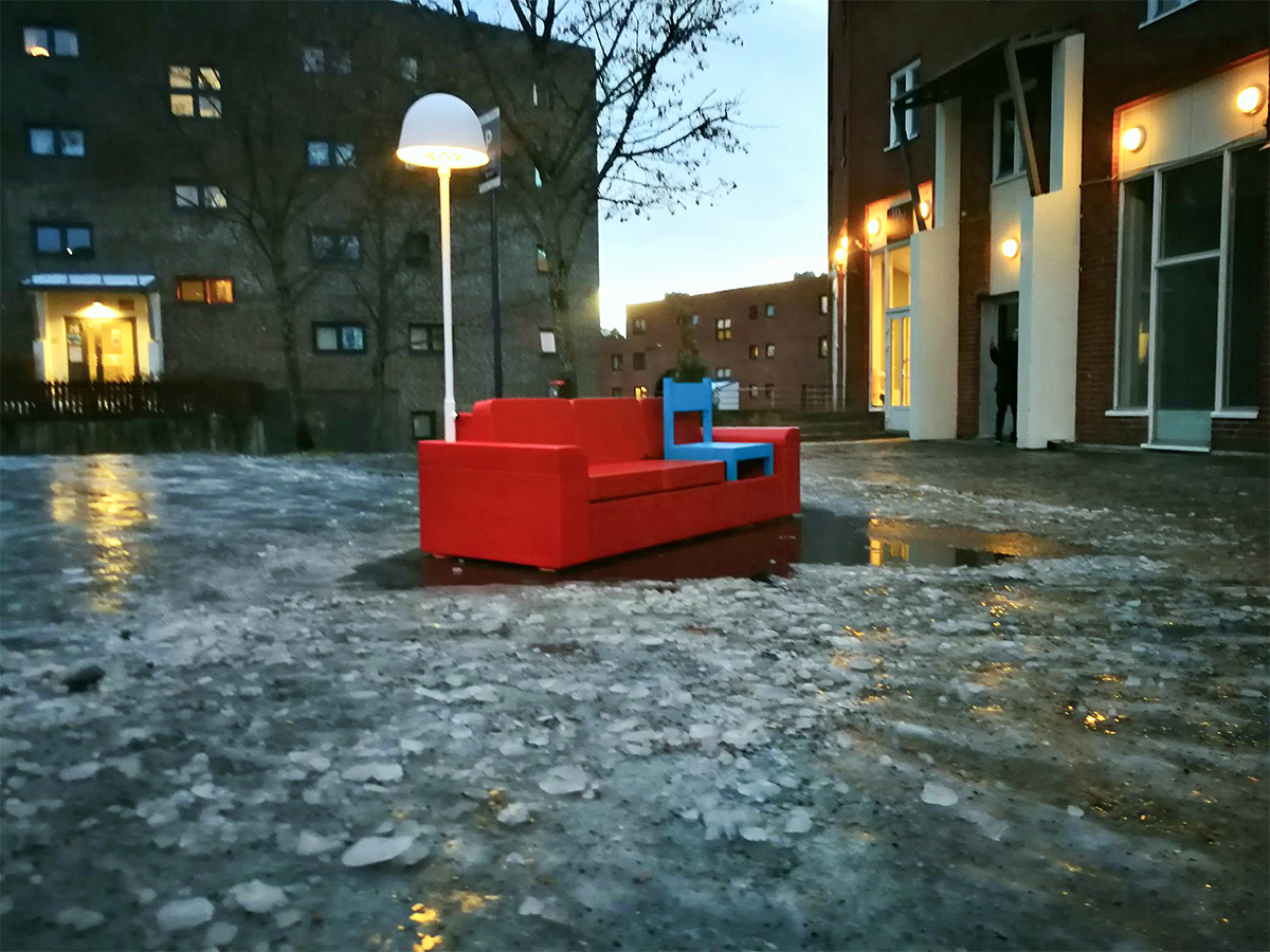 A permanent public artwork funded by Oslo Kommune and created in collaboration with Nabil Zaman, constructed from aluminium and installed in Holmlia Center. Includes a working TV that loops affirmative messages in various languages.